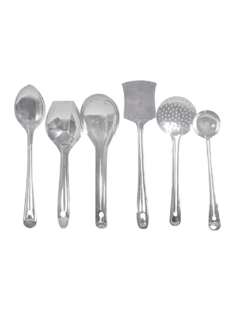 set of 6 kitchen serving tools - long vegetable cooking pan, biryani spoon, deep float, palta, zara, spoodle