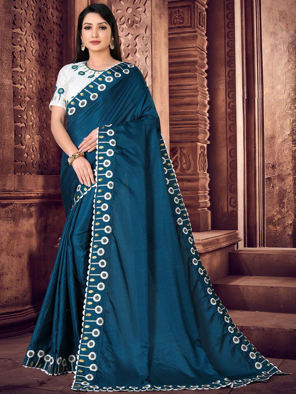 We offers Dola Silk Embroidered Saree with beautiful Lace work at border. Designer Saree have beautiful Heavy Embroidered Work and stone work at entire Saree & Blouse. Material of this saree is Dola Silk which is softer and skin friendly. Material of Blouse is Bangalore Silk (Dupion Silk). Blouse comes with contrast color matching with Saree color. These new traditional saree for women can be used as party wear saree, Festival saree & wedding saree also. Product colour may slightly vary due to photographic lighting sources or your monitor settings.