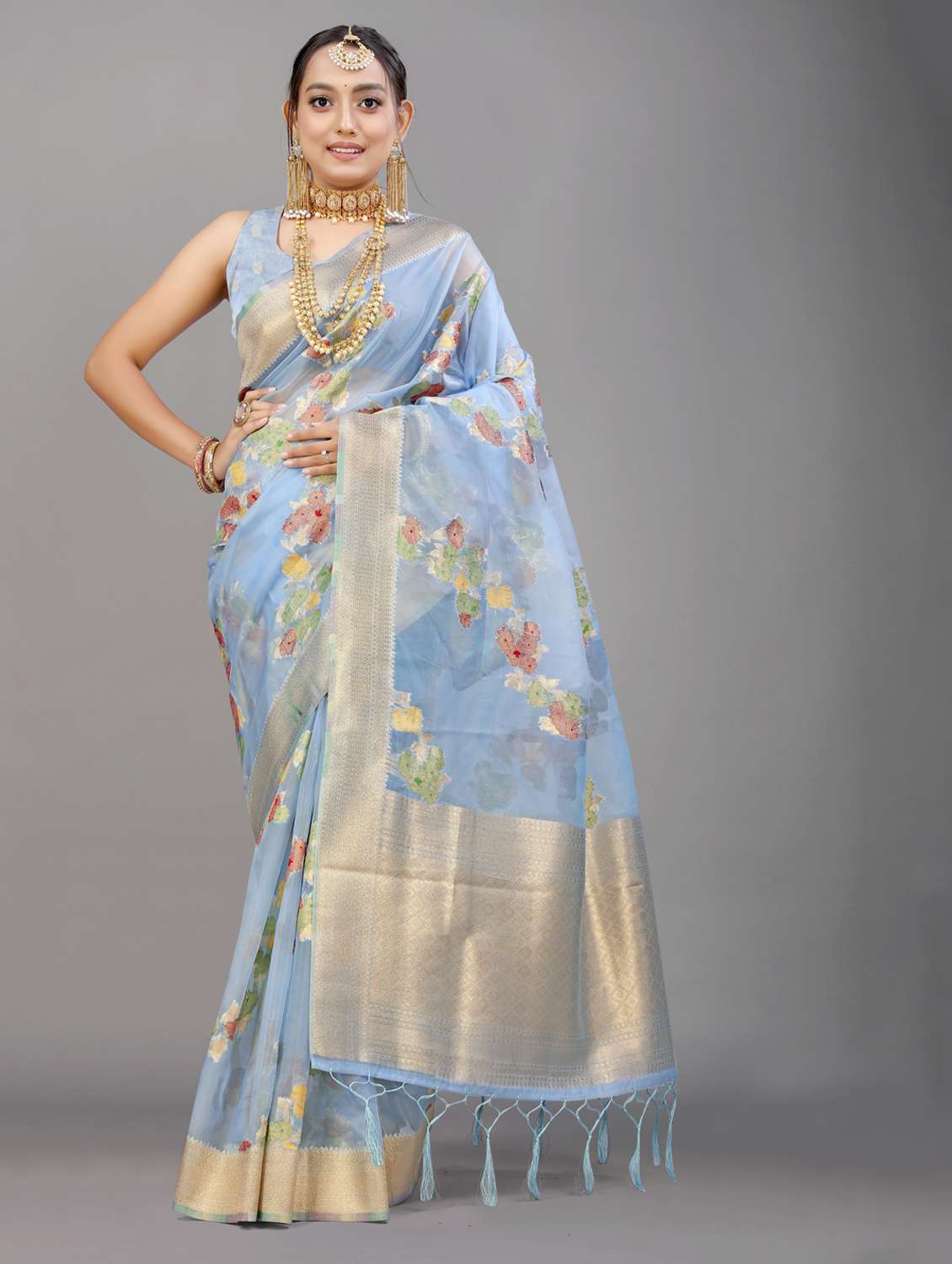 women's self design light blue colored saree with blouse