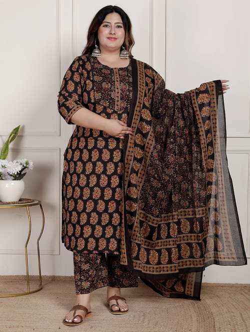 globus women orange sequin embroidered yoke straight kurta with sharara & patched lace contrast dupatta festive set