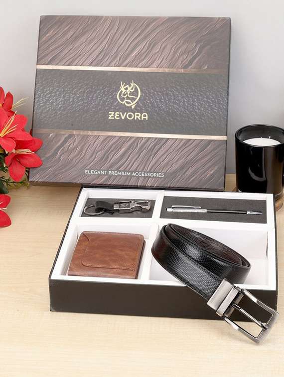 The Zevora Gift Hamper for Men is the ultimate combo gift set designed to impress. This pack of four includes a sleek leather belt, a stylish wallet, a practical keychain, and a sophisticated pen, making it a perfect choice for any occasion. Crafted with premium materials, the leather belt and wallet exude elegance and durability, ensuring long-lasting use. The keychain adds a touch of class and convenience, keeping keys organized. The pen, with its smooth writing experience, complements the set, making it ideal for professionals and daily use. Packaged in an elegant gift box, this set is perfect for birthdays, anniversaries, or any special celebration. Show your appreciation with the Zevora Gift Hamper for Men, a thoughtful and practical gift that combines style and functionality.
