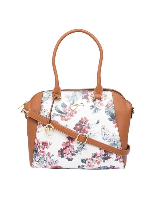 The multi-colored floral print adorns this tan colored shopper handbag. The detachable shoulder sling, ergonomic handles, golden hued brand logo and the ample space inside add to the appeal of the accessory.