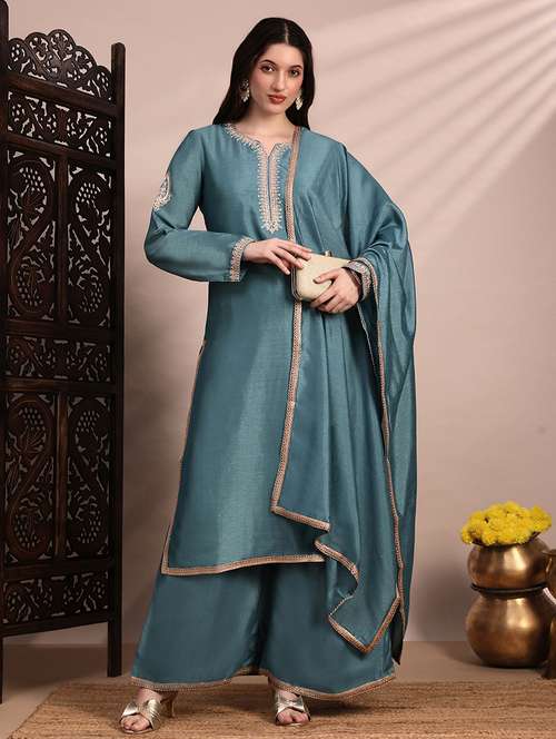 - » globus women taupe long sleeves round neck sequinned & zari embroidery work kurta with wide leg palazzos & dupatta festive set