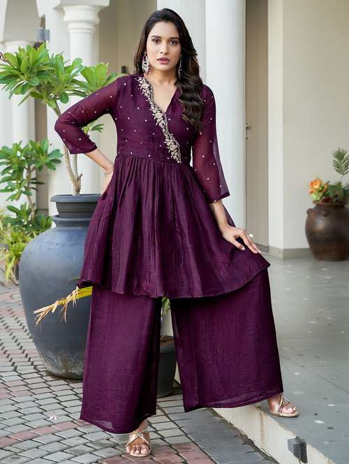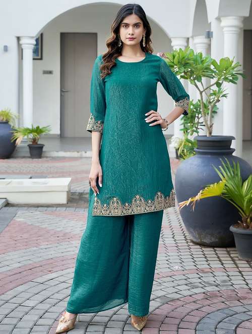 - Browse through the latest range of ethnic sets for women with tailored sleeve designs with embellished works.