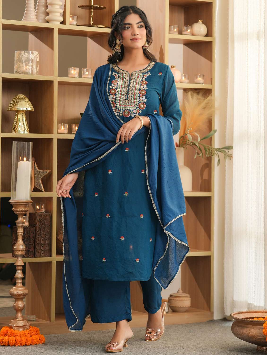 • Find gorgeous sets of ethnic wears in trending designs in teal colors suitable for festive wear of occasions.