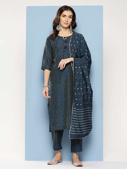 - Find gorgeous sets of ethnic wears in trending designs in teal colors suitable for festive wear of occasions.