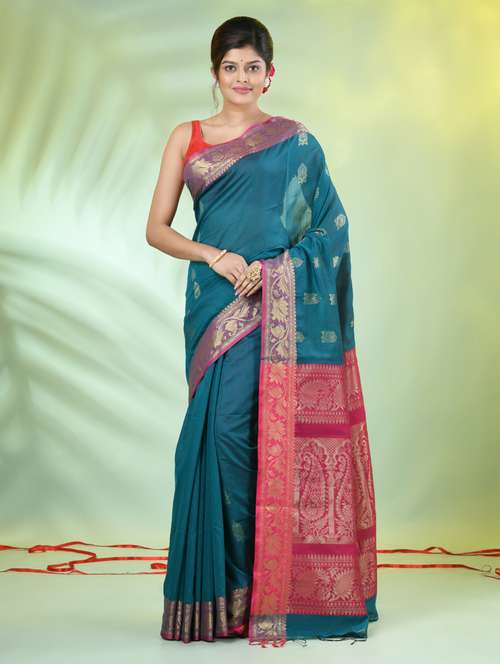 Indulge in sophisticated comfort with Teal Cotton Blend Saree With Nakshi Zari Borders, a fusion of softness and elegance. Combine it with a stylish blouse for a modern touch or enhance it with statement jewelry for a touch of glamour.