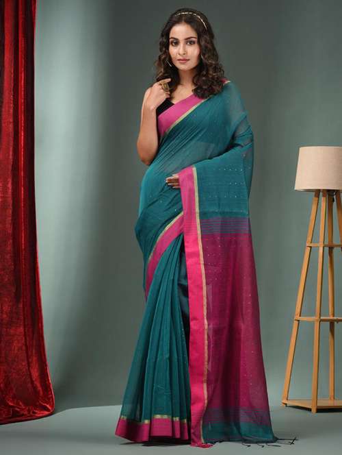 Look royal and loving in this teal green handwoven cotton blend handloom saree. It has woven designs and patterns for a beautiful look.
