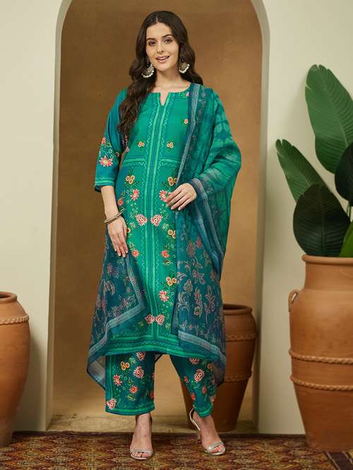• Find gorgeous sets of ethnic wears in trending designs in teal colors suitable for casual wear of occasions.