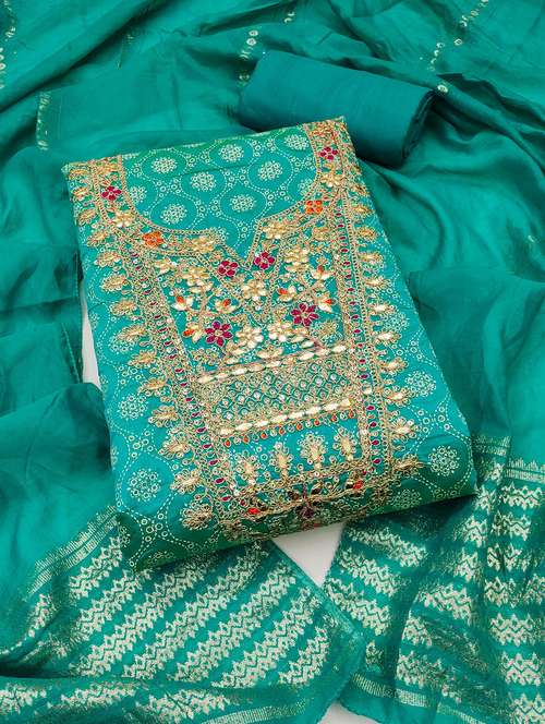 - Look ultra gorgeous in unstitched suits from Leeli Peeri Designer and grab these beautiful suits in turquoise colour.
