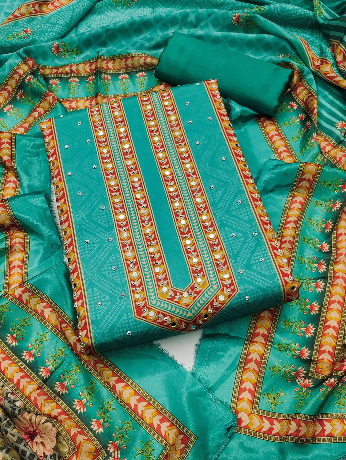 women printed embellished unstitched suit set