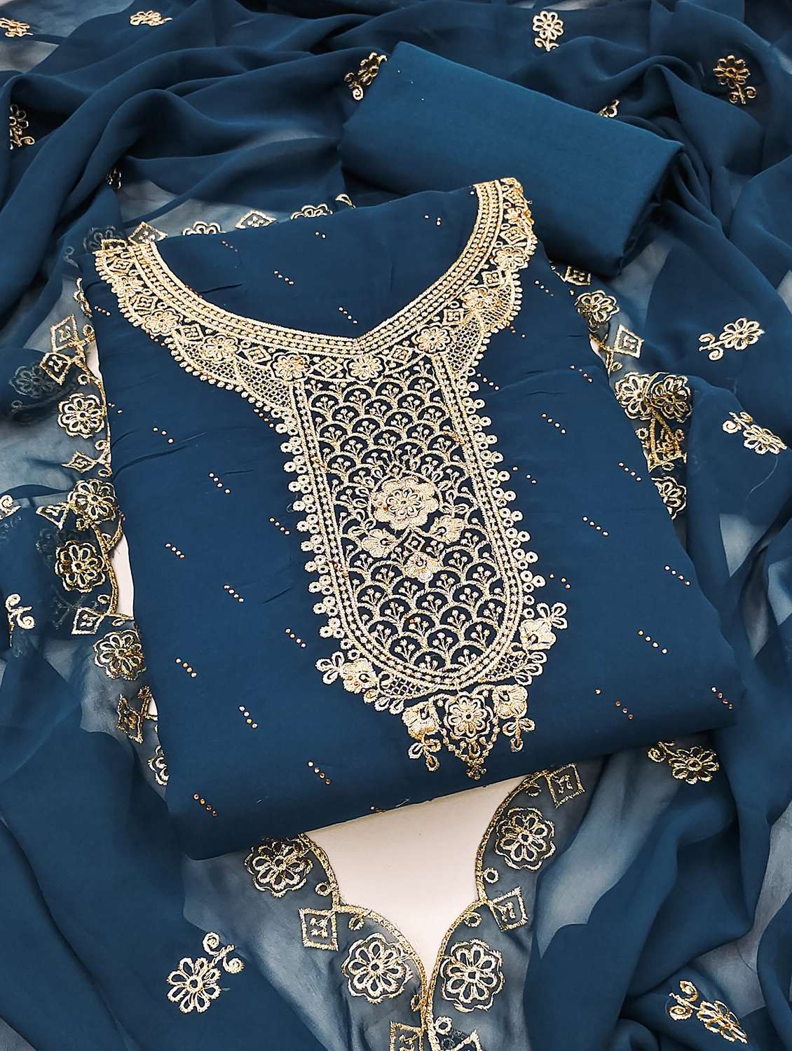 - Look ultra gorgeous in unstitched suits from Leeli Peeri Designer and grab these beautiful suits in teal colour.