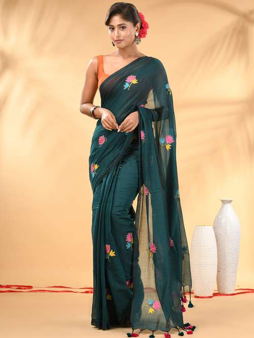 Embrace elegance and comfort with this stunning teal mulmul cotton saree, perfect for any casual or festive occasion. The soft and breathable mulmul fabric offers a light and airy feel, making it a perfect choice for warmer climates. The saree is beautifully adorned with vibrant floral embroidery, giving it a refreshing, lively look. The saree’s edges are embellished with charming tassel detailing, adding a playful and chic touch to the overall design. This saree is ideal for those looking to combine tradition with a contemporary flair.