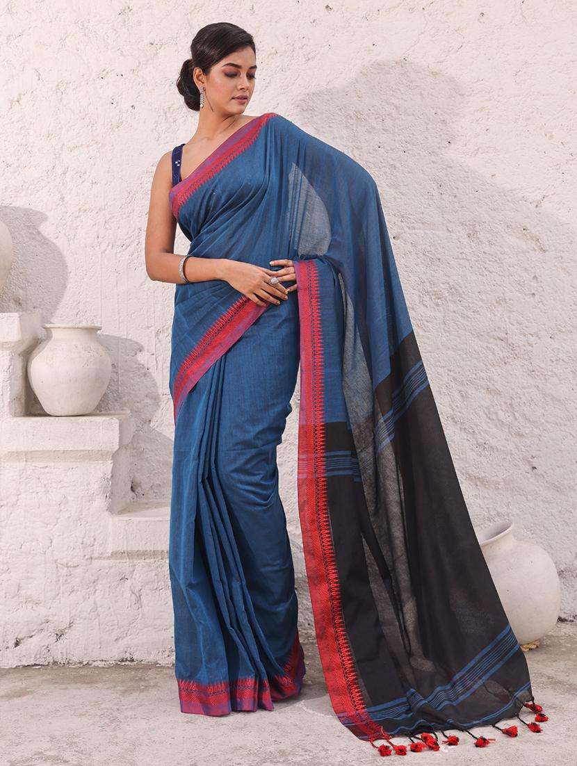 Look royal and loving in this teal blue cotton handloom saree. It has solid patterns and temple design borders for a beautiful look.