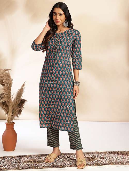 • Find gorgeous sets of ethnic wears in trending designs in teal colors suitable for casual wear of occasions.