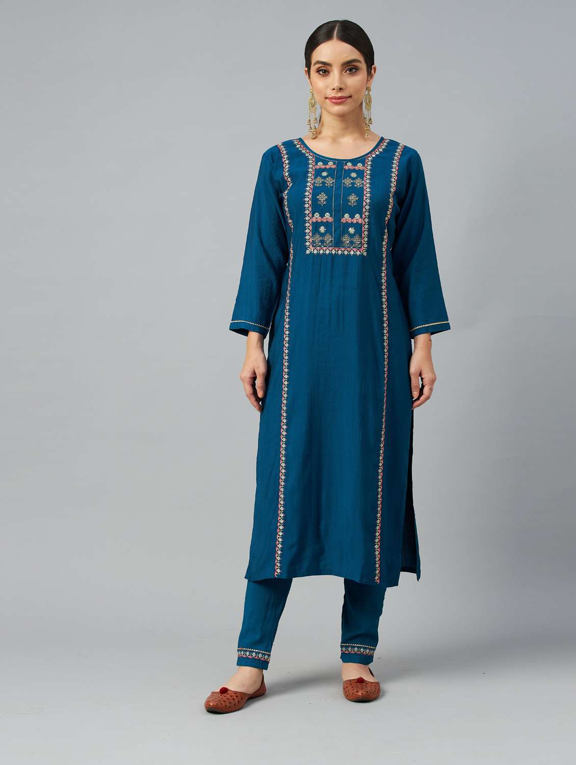 - Browse through the latest range of ethnic sets for women with tailored sleeve designs with embroidered works.