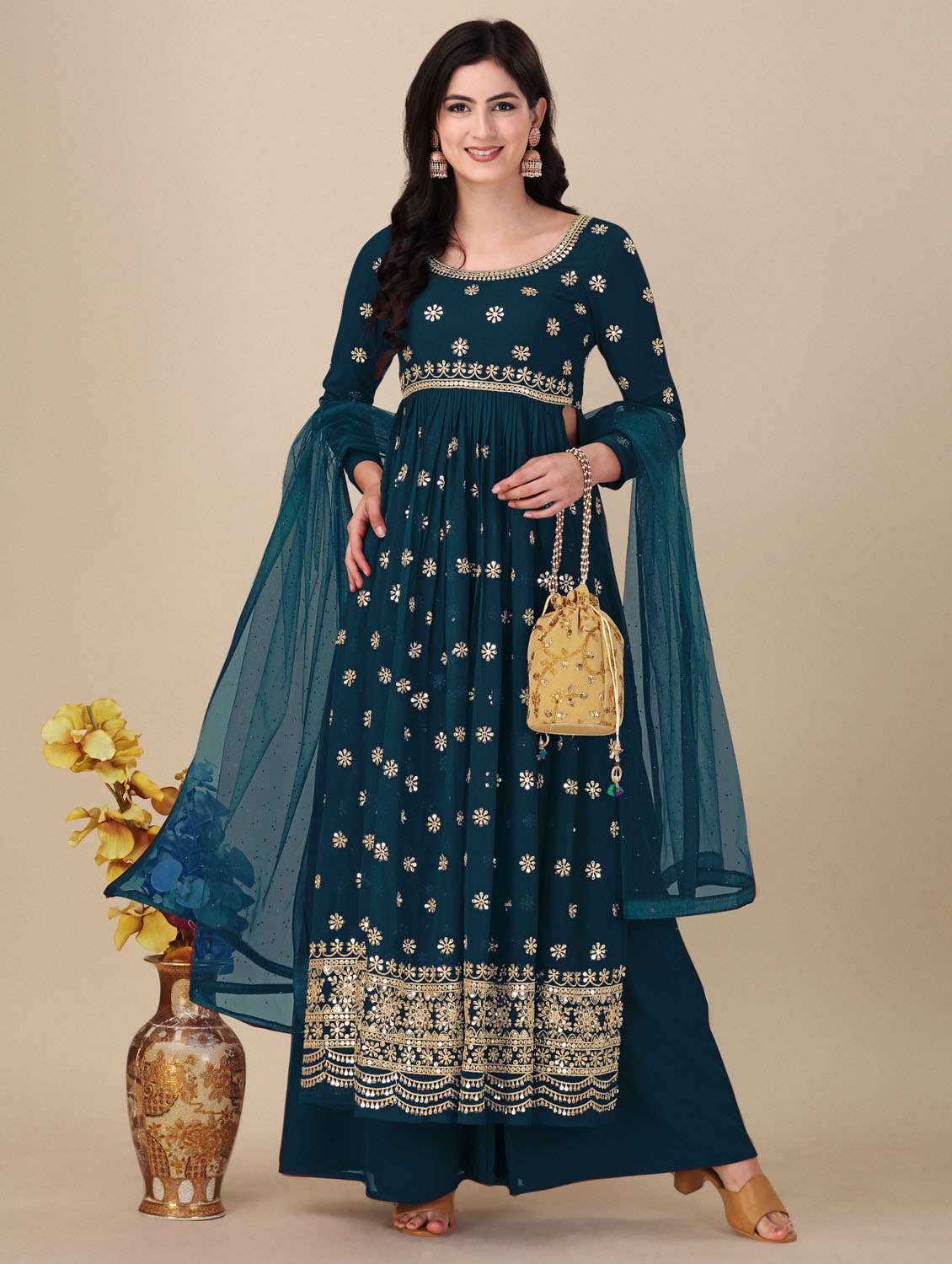 - Find versatile complete set of semi-stitched suits in trending designs in teal colors suitable for a number occasions.