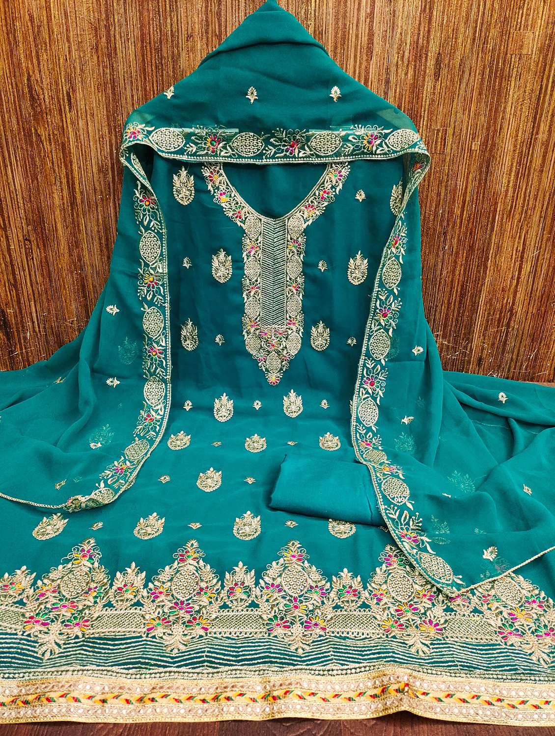 - Look ultra gorgeous in unstitched suits from Leeli Peeri Designer and grab these beautiful suits in turquoise colour.