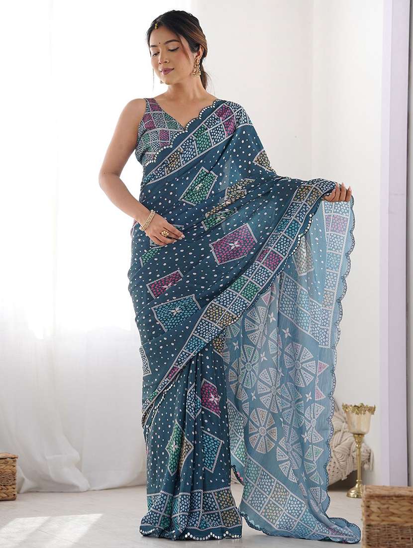 Georgette Bandhni Pattern Printed Morpichh Saree With Mirror Work Scalloped Border With Running Blouse Piece Morpichh georgette saree with traditional bandhni pattern, featuring mirror work and scalloped border. Paired with a running blouse piece.