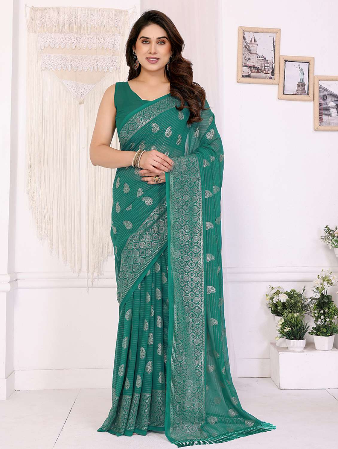 Rama Georgette Foil Printed Saree: Featuring a soothing rama shade, this saree is adorned with foil prints. The lace border and teasels contribute to its refined look. Comes with a blouse piece.