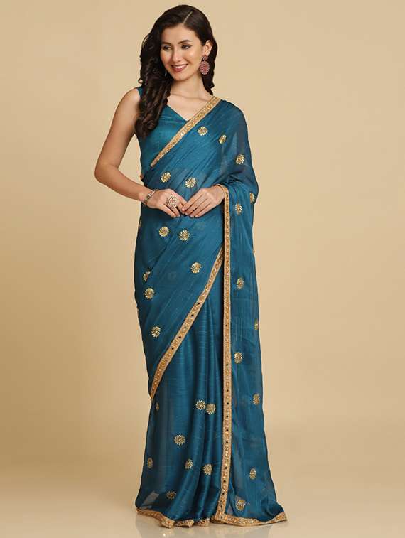 - » women teal georgette embroidery mirror work saree