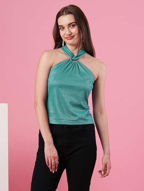 Elevate your party wardrobe with the HALTER NECK SHIMMER PARTY DRESS in teal from Globus. This halter neck party top features a sleeveless design, solid pattern, and a regular length for a sophisticated look. Crafted from polyester, it offers a comfortable fit and a touch of shimmer, making it an excellent choice for festive occasions.