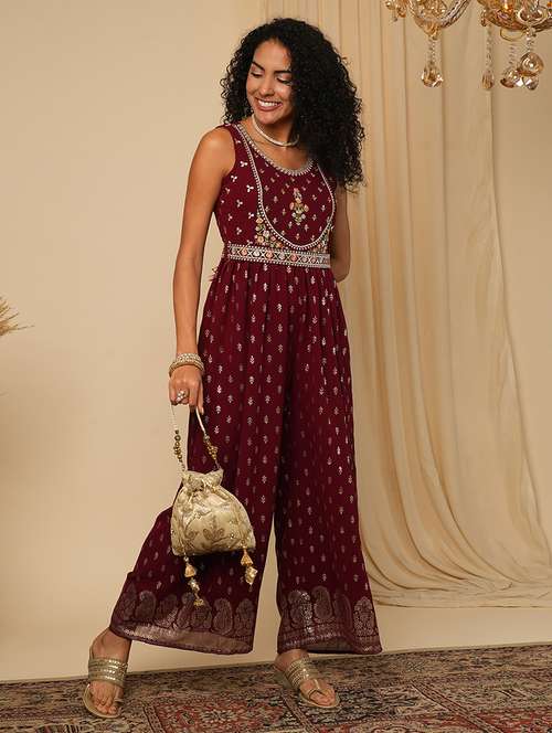 - » globus women blue zari embroidered yoke allover ethnic motifs foil print pleated fusion jumpsuit with belt