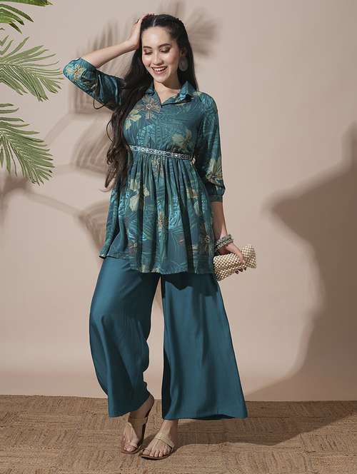 globus women teal shirt collar tropical print peplum style tunic with palazzos & embroidered belt fusion co-ord set
