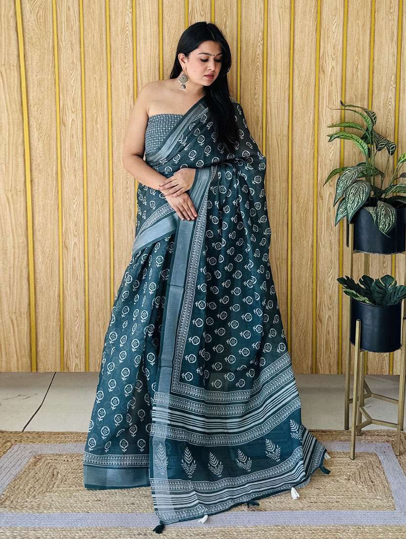Teal Soft Linen Cotton Digital Print Saree With Woven Silver Border