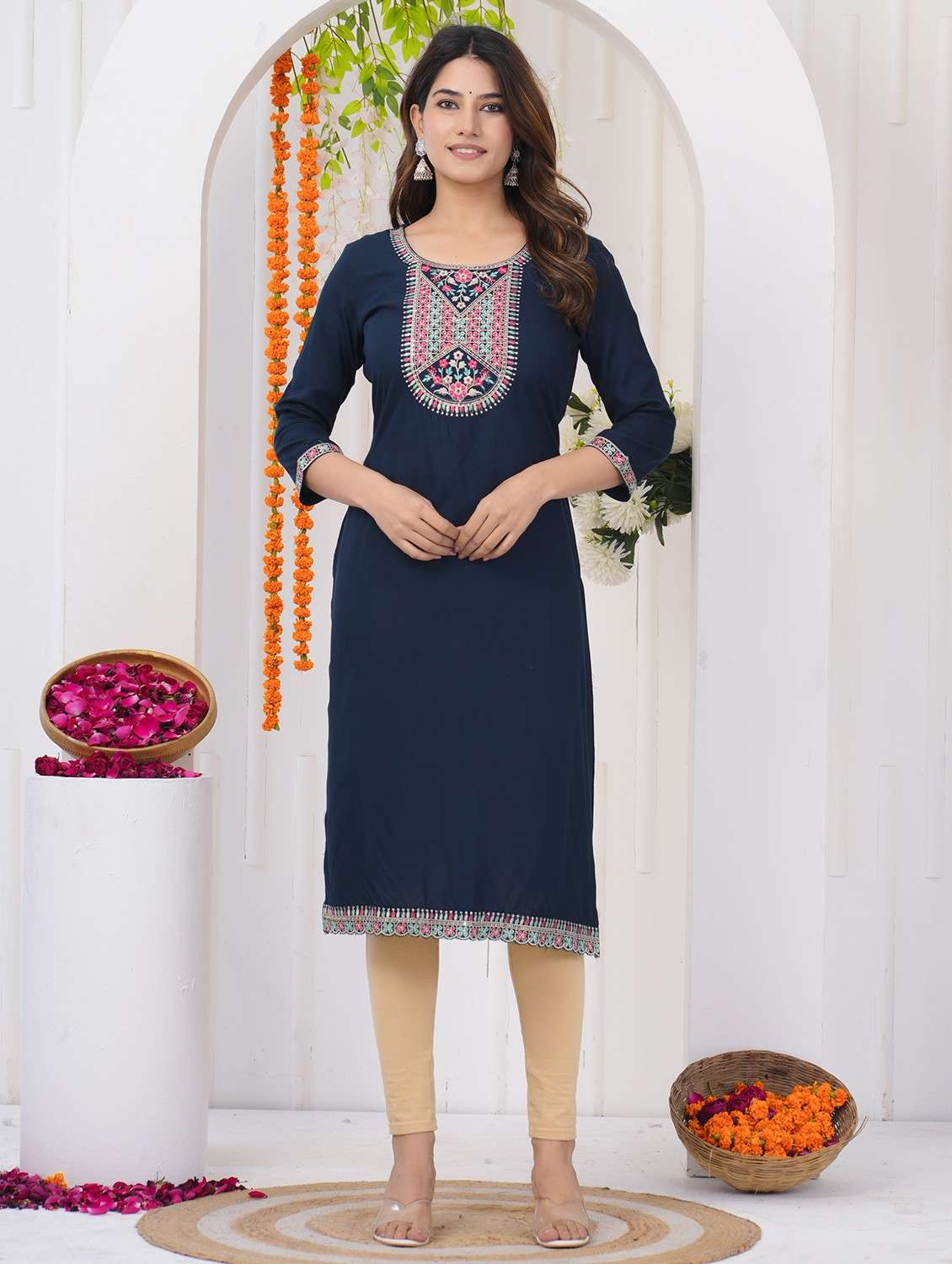 women embroidered three quarter sleeve straight kurta