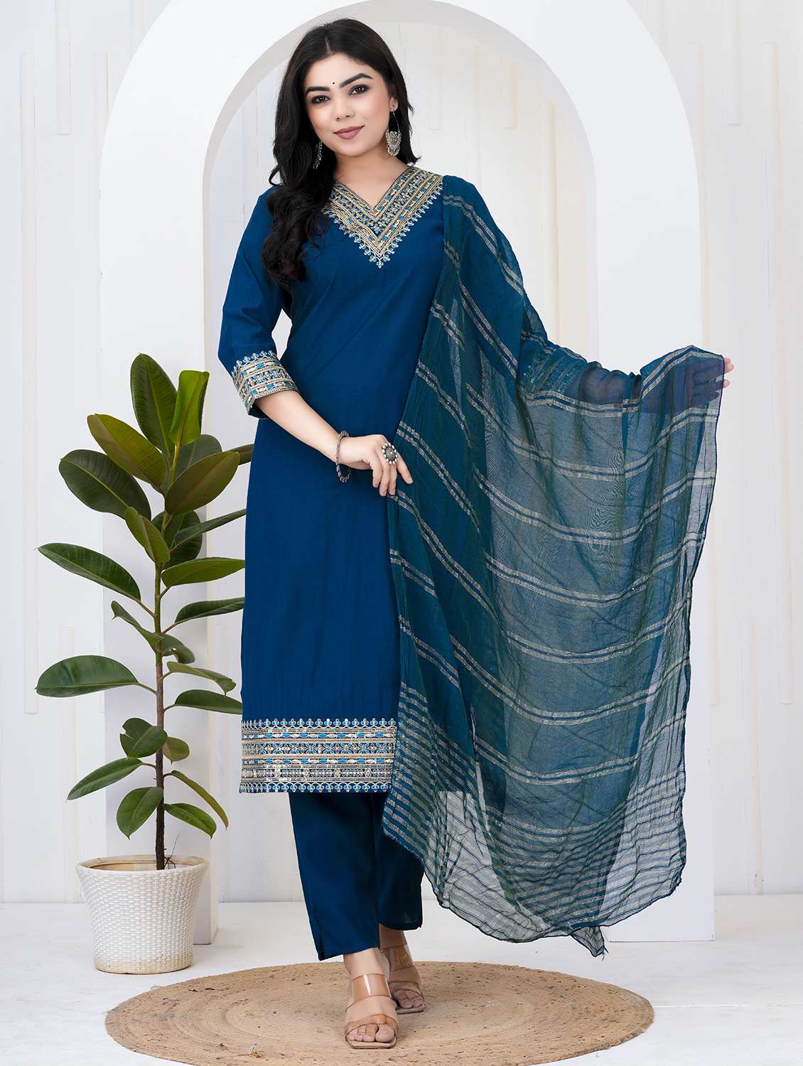 women three quarter sleeve kurta pant with dupatta set