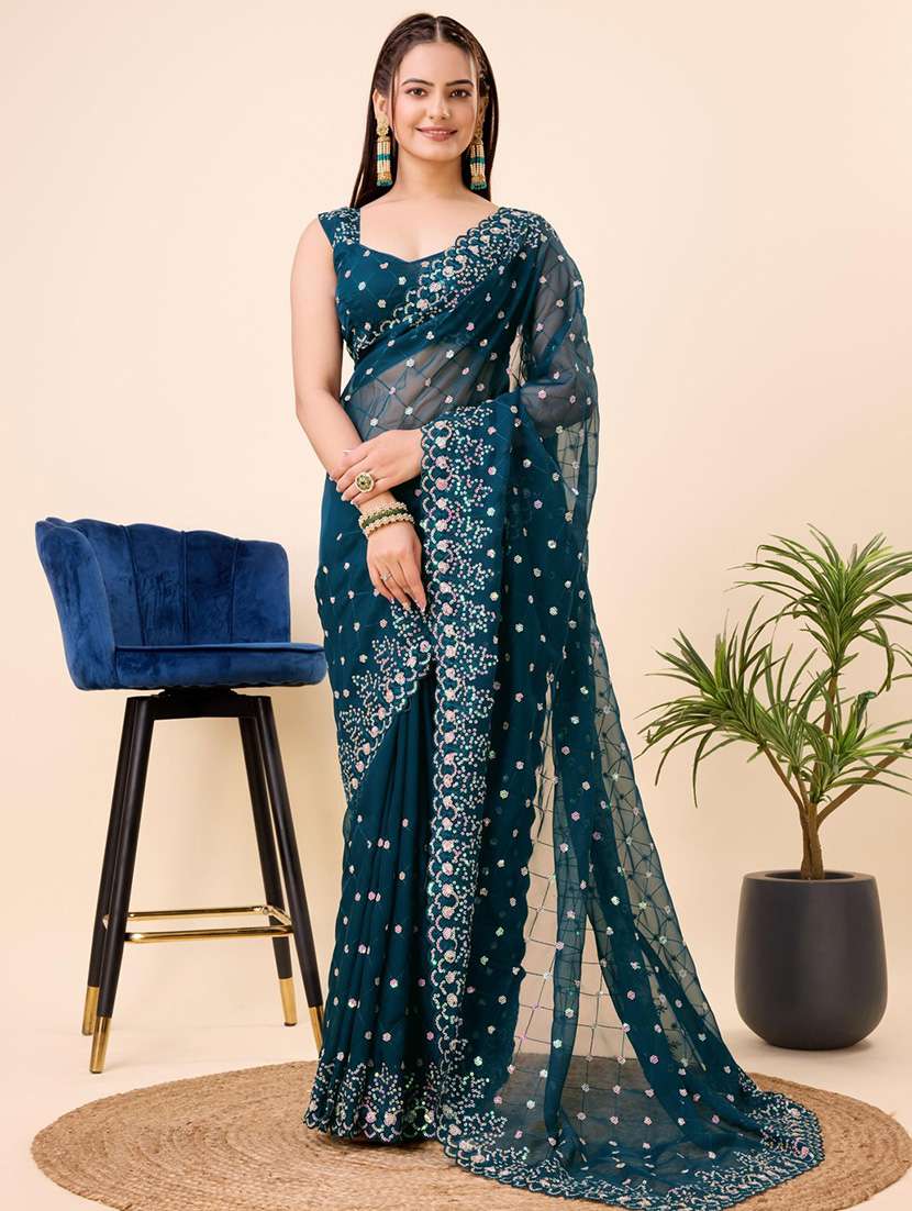 - » teal organza embroidered saree with blouse