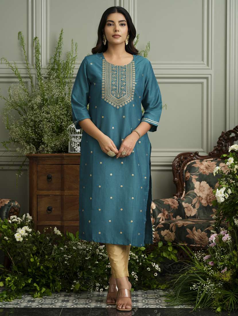 - » women solid with work three quarter sleeve straight kurta