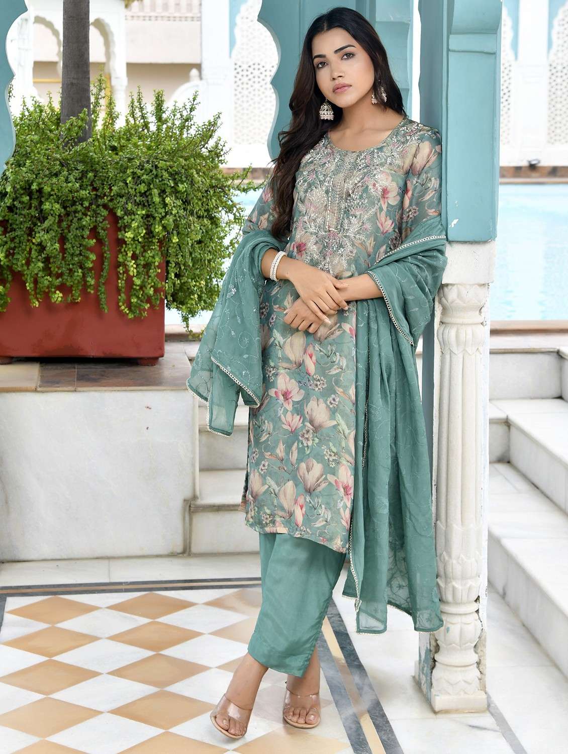 - Find gorgeous sets of ethnic wears in trending designs in teal colors suitable for festive wear of occasions.