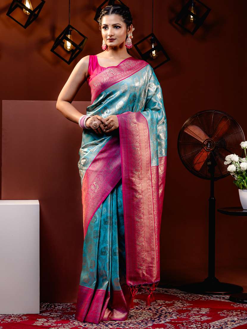 Turquoise Blue color Traditional Saree, With Woven Zari design All over , Has Zari woven border and pallu and Tussel Work at the end , Comes With Pink Color Contrast Unstiched Brocade Blouse (Attached At the Last Of Saree)