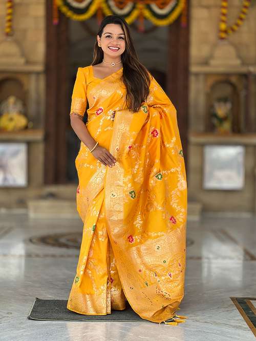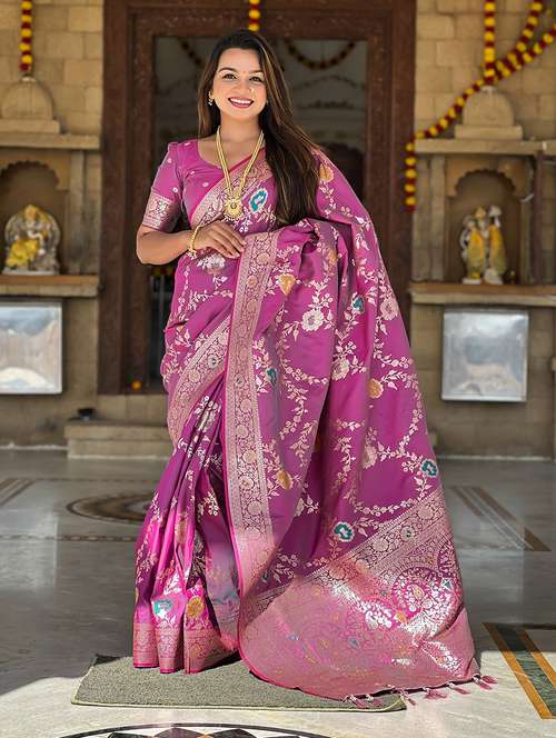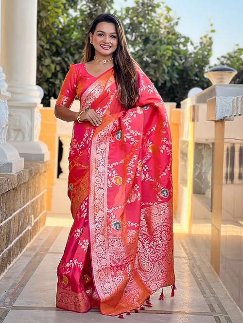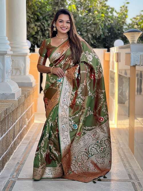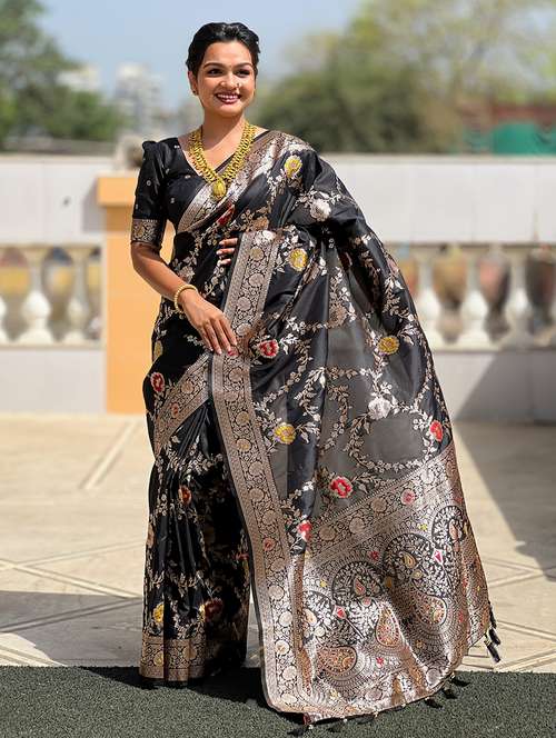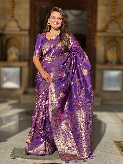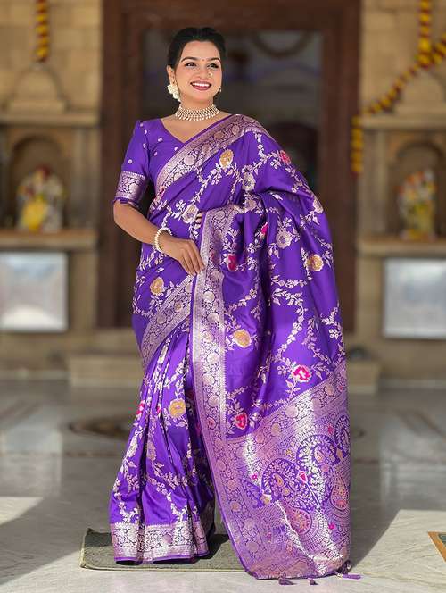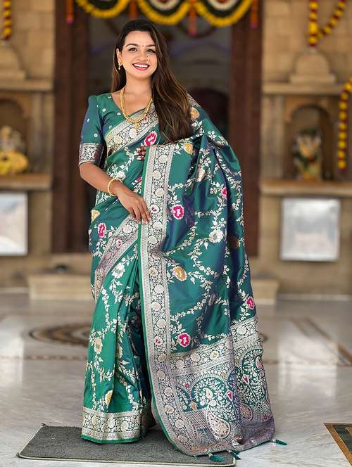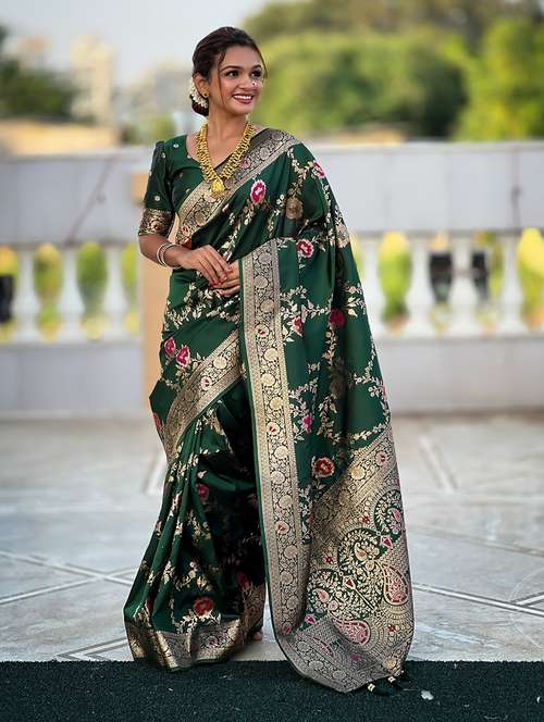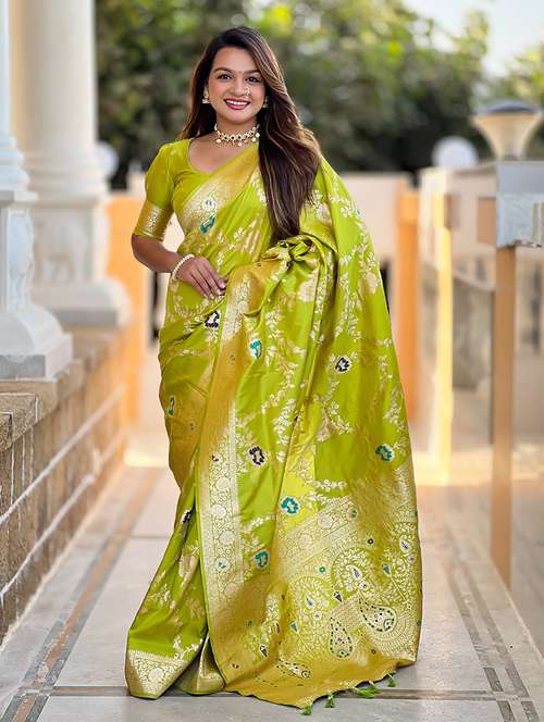 We offers Banarasi Softy Silk Saree with Rich intricate Golden Zari Meenakari Jacquard work at all over body, Border & Grand Pallu. Blouse, Border and Pallu have very fine zari matching with Saree body. Saree has beautiful zalar (Tessel) work at pallu. Saree & Blouse Material is Litchi Silk which very Soft and Skin Friendly material. This Saree has a Length 6.30 Meter Which Includes 0.8 meters of the blouse. These new Bollywood designer fashionable saree for women can be used as Party wear saree, Festival saree, wedding saree on every Occasions. Product colour may slightly very due to photographic lighting sources or your monitor settings.