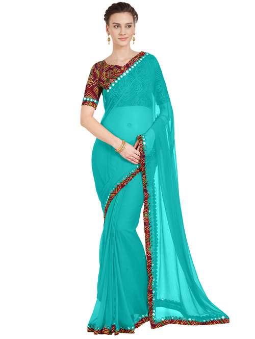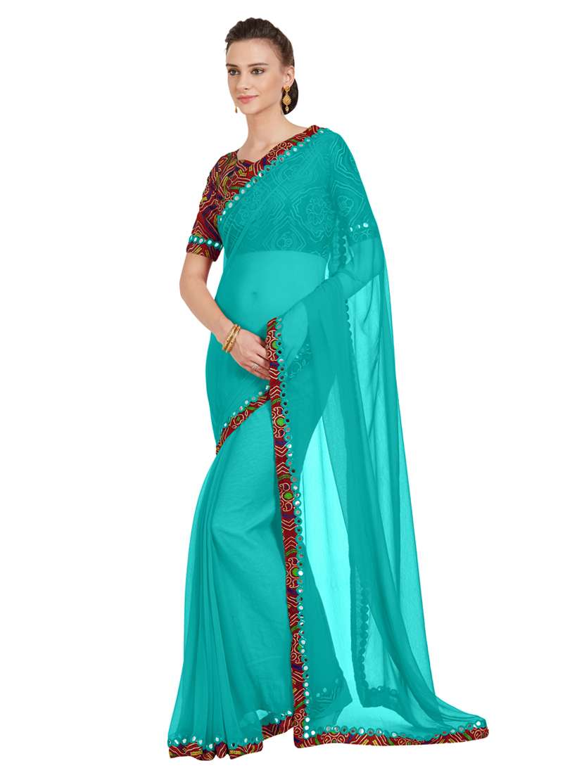 This is a turquoise color chiffon bandhani print with olastic mirror lace border work party wear saree with blouse piece.