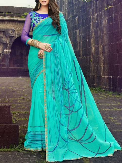 - » turquoise cotton blend printed saree