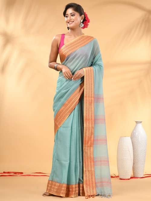 Elevate your ethnic wardrobe with the timeless charm of the Turquoise Blue Soft Mulmul Cotton Saree. Crafted from soft, breathable mulmul cotton, this saree features a soothing turquoise blue base complemented by vibrant borders and a contrasting pallu adorned with traditional woven stripes. Lightweight and elegant, it's perfect for everyday elegance, festive gatherings, or summer occasions. The saree drapes effortlessly, offering comfort without compromising on style.
