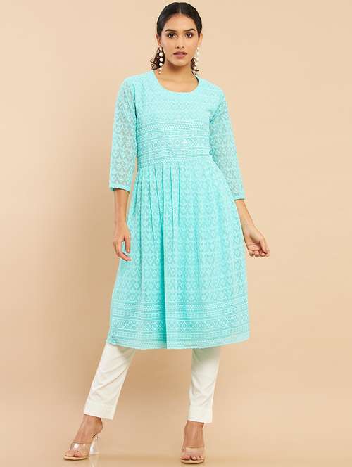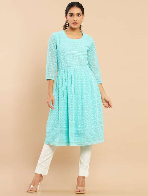 - Grab this beautiful kurta made up of georgette fabric featuring round neck designs.