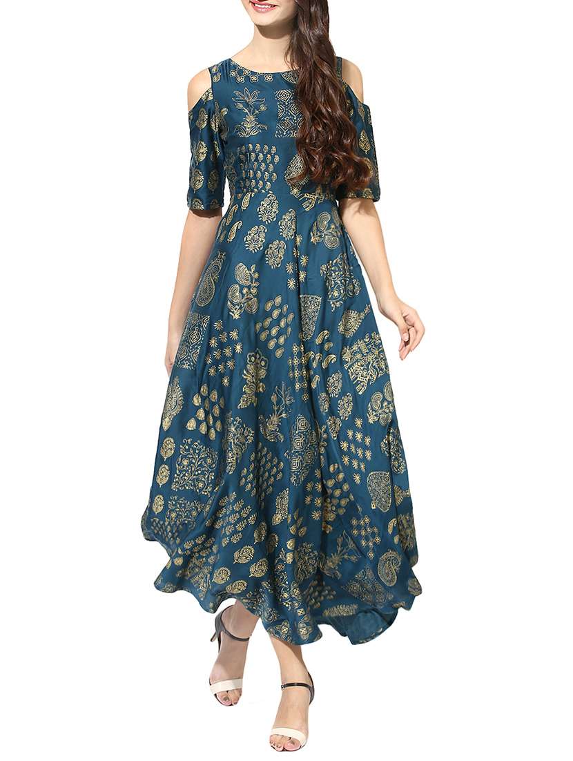 - » Gold foil print cold sleeves flared kurta