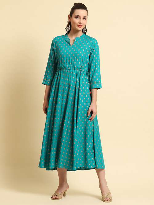 turquoise rayon fit & flare ethnic dress