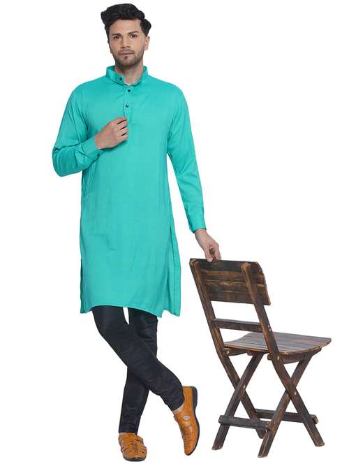 Veera Paridhaan Solid Rayon Long Kurta for Men (Turquoise, Size: 36)- The Kurta is Ideal to be worn with trousers/Pant Payjama, Churidar or Dhoti .Pair these fashionable Full sleeve Solid Rayon Long Kurta with sandals, mojaris and you can get compliments for your perfect styling. Made from smooth Rayon fabric, this one can surely make you earn brownie points.