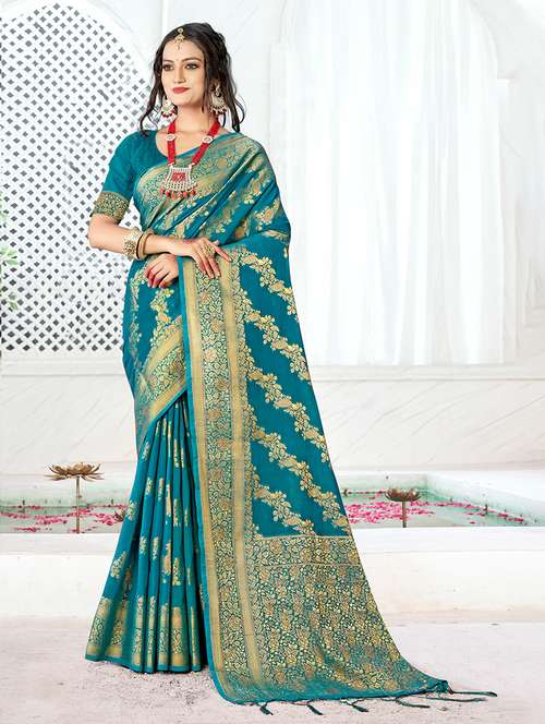 women's self design turquoise colored saree with blouse