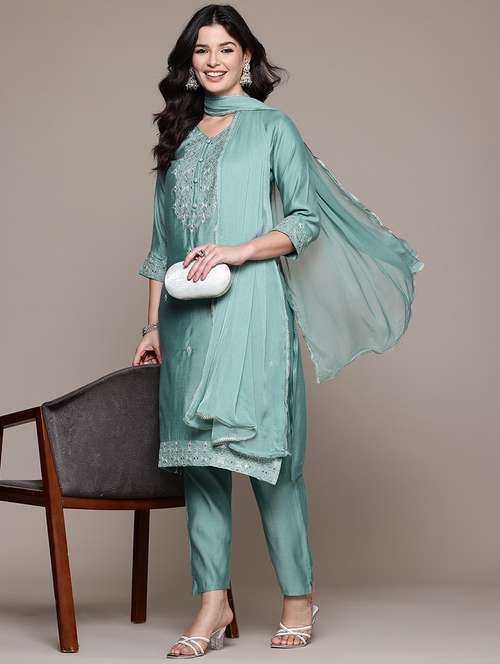 - Find gorgeous sets of ethnic wears in trending designs in turquoise colors suitable for festive wear of occasions.