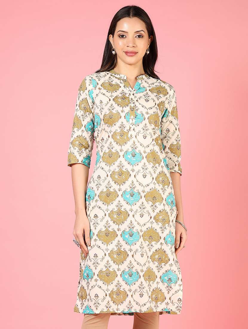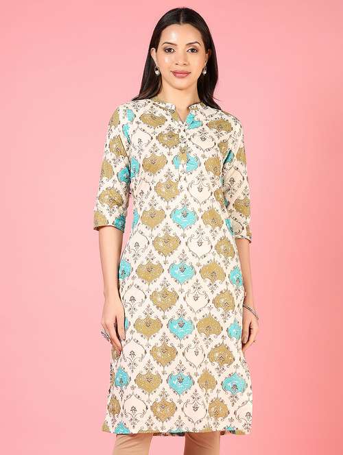 - Grab this beautiful kurta made up of cotton fabric featuring notch neck designs.