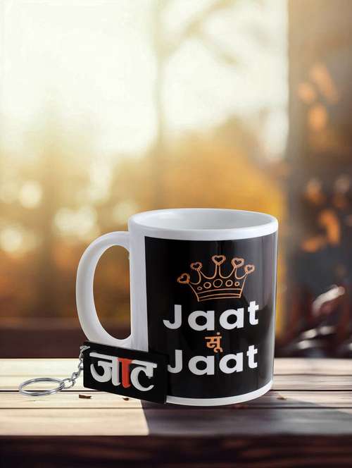 This elegant Black tone white ceramic mug from Memoir is the perfect companion for your morning coffee or evening tea. With a classic design and a generous 240ml capacity, it offers a comfortable grip and a sturdy construction that is microwave and dishwasher safe. The mug features the famous JAAT community slogan dialogue \"JAAT SU JAAT \"making stylish proud declaration of the caste you belong. it a stylish addition to your office or home decor and proudly declaring the fun assocaited with the community. Comes with a matching and compatible JAAT hindi font PVC all weather attractive multi colour keychain. Crafted with care, this opalware mug is bone-ash free, ensuring a safe and enjoyable drinking experience. Complement your mug with the included keychain, adding a touch of personality to your daily routine. Ideal for gifting or personal use, this mug set combines functionality and style seamlessly.