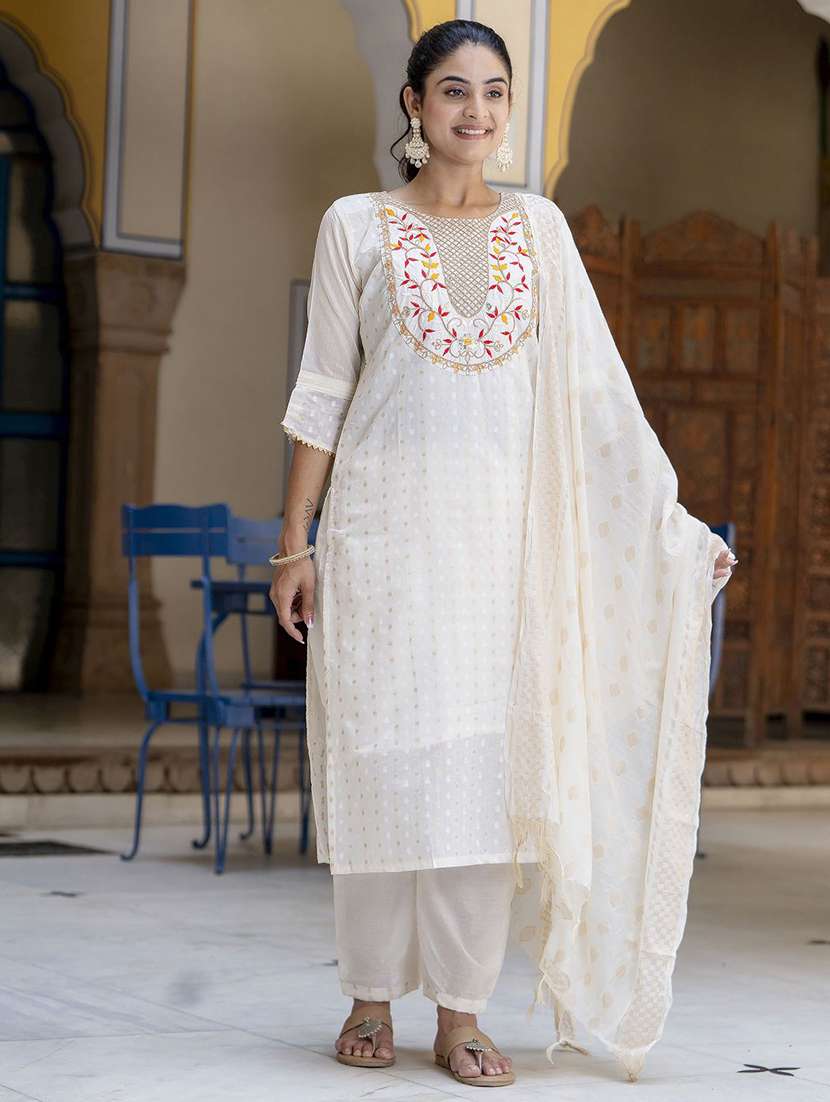 - Find gorgeous sets of ethnic wears in trending designs in white colors suitable for festive wear of occasions.