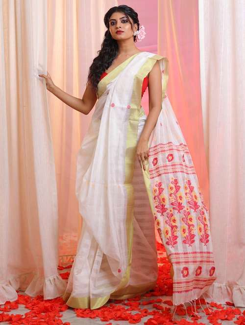 Get an enchanting look in this white cotton blend handwoven saree. It has stripe weave along with floral buttas all over the body. The borders have zari woven pattern along the length. The pallu is highlighted with floral nakshi patter to compliments the look beautifully.