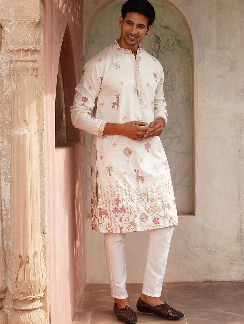 white cotton blend kurta pyjama ethnic wear set